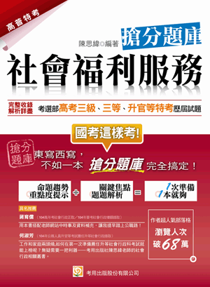 序言 必須要知道的考試相關資訊 Chapter1 社會福利與福利理論 Chapter2 社會安全 Chapter3 社會福利組織與福利服務方案評估 Chapter4 社會福利財務制度與福利服務輸送 Chapter5 經濟弱勢者與就業福利服務 Chapter6 兒童及少年福利服務 Chapter7 婦女與家庭福利服務 Chapter8 身心障礙者與老人福利服務 Chapter9 健康照顧與多元文化福利服務 附錄 最新試題