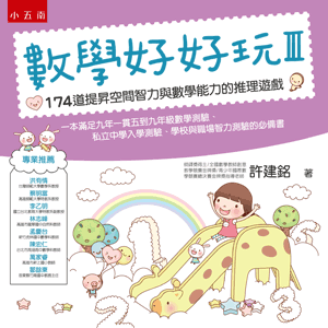 感謝讀者對《數學好好玩》(I)(I I)的肯定與喜愛,作者再接再厲用心完成《數學好好玩》(Ⅲ),敬請所有讀者繼續支持,也不吝給予鼓勵與指教。更期待藉由推廣這一系列的書,使社會大眾更親近數學、熱愛數學,並使我國的數學教育更進步,更具國際觀。 本書內文仍規劃為「打通推算思路」與「啟發圖形智慧」兩個主題,而所有題材的設計,皆以蘊涵關鍵性、開放性或創造性的思考空間為主要考量,相信它能夠引導讀者跳脫僵化思考的框架,使腦筋的運作更為理性與靈活。 而手腦並用解決每道問題的探索過程,不只可以幫助各年齡層的讀者應付考場與職場上的智力考驗,對於中小學生數學能力的進化與數學學習興趣的啟發,更可帶來潛移默化、涓滴成河的正面效益。