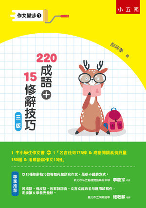 本書特色: 一、每篇作文都各自運用一種修辭技巧來起頭,全書共有十五種破題技巧,例如:建立疑問法、驚嘆共鳴法、如果假設法、引述名言法、顛倒順序法、開門見山法等等。 二、每篇作文都設計「修辭技巧」單元,逐一解析行文時所運用的不同修辭技巧,包括:設問、誇飾、層遞、類疊、轉化等等。 三、附錄創新實用多元化,可以有效協助學子運用修辭、分類成語寫作文,同時不再寫錯別字。其內容包括:常見作文修辭法、常用成語正誤用簡明對照表、常見婚喪喜慶讚美題辭、實用分類成語。 四、隨書附贈的別冊──成語小達人,內容包含:名言佳句175條 & 成語閱讀素養評量150題 & 用成語寫作文10回,隨看隨測,有效增進作文寫作功力。