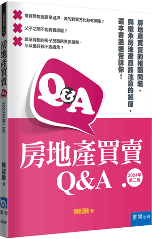 PART 1 預售屋 Q1 預售屋之銷售面積 Q2 房屋面積誤差的爭議 Q3 房屋面積的容許誤差 Q4 附屬建物之登記 Q5 房屋公設面積之計算 Q6 房屋基地持分之計算 Q7 預售屋基地的過戶時間 Q8 房屋竣工前之土地過戶 Q9 預售屋基地提早過戶的合理性 Q10 土地增值稅的繳納人 Q11 預售屋買賣契約的陷阱 Q12 地下室的產權登記 Q13 購買預售屋的簽約對象 Q14 與契約效力有關之衍生規定 Q15 預售屋產權登記之地政士的聘任