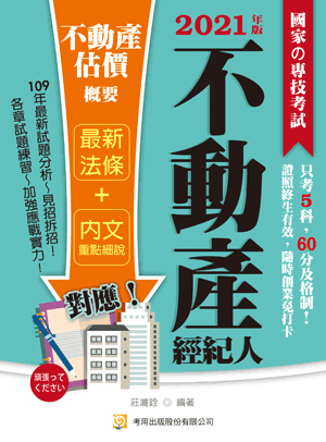 導 論 第一章 不動產估價基本概念 第二章 估價作業程序 第三章 估價方法 第一節 比較法(技術規則18∼27) 第二節 收益法(技術規則28∼47) 第三節 成本法(技術規則48∼69) 第四節 土地開發分析法(技術規則70∼81) 第四章 宗地估價 第五章 房地估價 第六章 土地改良物估價 第七章 權利估價 第八章 租金估計 第九章 公部門相關估價(補充) 附 錄 最新試題與解析