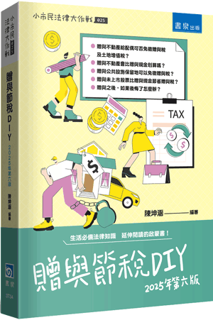 壹、贈與不動產給配偶免徵贈與稅、土地增值稅 ──您怎麼申報贈與稅?怎麼辦理贈與登記? 貳、二親等以內親屬間不動產移轉,主張「買賣」可以免徵贈與稅 ──您怎麼申報贈與稅?怎麼辦理買賣不動產移轉登記? 參、贈與不動產比贈與現金划算 ──您怎麼申報贈與稅?怎麼辦理贈與登記? 肆、贈與附有貸款的不動產可以主張扣除貸款部分 ──您申報贈與稅時怎麼主張扣除? 伍、農地贈與給繼承人可以免徵贈與稅 ──您怎麼申報贈與稅?怎麼辦理贈與登記? 陸、贈與公共設施保留地可以免徵贈與稅 ──您申報贈與稅時怎麼主張?怎麼辦理贈與登記? 柒、贈與未上市股票比贈與現金節省贈與稅 ──您怎麼申報贈與稅? 捌、每年贈與244萬元免徵贈與稅 ──您怎麼申報贈與稅? 玖、子女婚嫁時,父母贈與100萬元免徵贈與稅 ──您怎麼申報贈與稅? 拾、贈與之後,如果後悔了怎麼辦? ──可以辦理撤銷贈與嗎?已繳的稅金可以申請退還嗎? 拾壹、「生前贈與」與「死後繼承」 ──哪一項省稅?您該怎麼判斷?