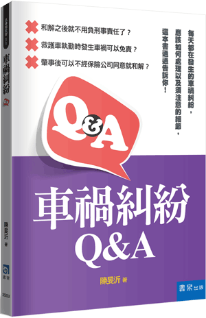 PART 1 法律責任篇 Q1 法律責任的種類 Q2 法律責任的成立要件 Q3 肇事者之刑事處罰 Q4 大小車相撞的責任 Q5 賠償之因果關係 Q6 車輛借人後肇事 Q7 乘客的責任 Q8 和解後的刑事責任 Q9 刑事責任執行完仍要負民事責任 Q10 肇事責任認定 Q11 鑑定報告的效力 Q12 相當因果關係 Q13 客觀歸責理論 Q14 肇事波及第三人 Q15 乘客承擔己方駕駛的過失責任 Q16 繼承人的賠償責任 Q17 後車追撞的責任 Q18 車禍後自首 Q19 未成年子女之父母的法律責任 Q20 雇主連帶賠償責任 Q21 借名登記的連帶賠償責任 Q22 董事長的連帶賠償責任 Q23 先與受僱人和解的後果 Q24 緩刑期間肇事 Q25 救護車的肇事責任 Q26 寵物飼主的責任 Q27 道路坑洞與國家賠償 Q28 加重或減輕刑責 Q29 車禍衍生糾紛 Q30 小朋友站立在機車踏板 Q31 機車追撞自行車 Q32 「信賴原則」之抗辯