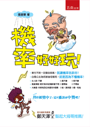 Chapter 1 機率,我真的搞不懂你啊!: 女人說「不要」時,到底是「真不要」還是「假不要」? 男人永遠搞不懂! 對於機率,你是否也有這種感覺? Chapter 2 隨機不隨便: 隨機,隨機,人人朗朗上口,卻未必能真懂隨機意涵, 當然,若說誤解的第一名,就是將隨機當隨便。 Chapter 3 大位不以智取,請用擲筊: 在2007年春,各政黨陸續舉辦總統初選, 陳總統開玩笑的說,選總統要天命, 乾脆大家一起到前主席黃信介墓前擲筊來決定。 這一席話果是語出驚人,擲筊選總統,當真前所未聞。 Chapter 4 XX配不配: 長昌配,長昌配,長昌配完呂游配, 到底有幾種可能的組合呢? Chapter 5 聖筊八連莊: 連續擲出8次聖筊機率有多少?答案是1/6561 若有人真要聖筊八連莊的話, 那這下可就苦了神明了…… Chapter 6 O型巨蟹男最容易中樂透嗎?: 什麼樣的人最可能中樂透? 台北富邦銀行從五年來、近千位千萬以上得獎者中分析, 其中,男性、四十歲到四十九歲、血型O型、 巨蟹座等特質者中頭獎機率最高。 如何正確解讀這個資訊呢? Chapter 7 獨不獨立沒關係: 兩件事情毫不相干稱之為獨立。 事件是否獨立有些可從經驗邏輯判斷, 有些卻是來自我們的主觀判斷。 Chapter 8 歹路不可行-下下籤的機率: 到廟裡拜拜,順便抽個籤詩, 問問自己今年運勢,是台灣人的重要習俗。 就連小偷也不能免俗! 到底他抽中下下籤的機率有多高? Chapter 9 樂透狂想曲: 常有人比喻中頭獎機率比被雷打中還低, 若那一天真被雷打到了, 那第一件事就是趕快去買張樂透吧! Chapter 10 發票雞肋說: 有人形容發票是「食之無味,棄之可惜」, 之所以說食之無味,是因為中獎低率低, 而棄之可惜是每天都拿這麼多發票,丟掉總是可惜, 也許還可中個200元,買買飲料,聊勝於無。 Chapter 11 香腸伯的統計學: 香腸伯的彈珠檯為何總能穩賺不賠? 是香腸伯真的懂統計學嗎? Chapter 12 槓.槓.槓.槓.槓.槓(回音): 連續六期頭獎摃龜, 大家都期待自己是第七期頭獎的幸運兒。 問題是,第七期槓龜的機率有多高呢? 這跟「連續七期槓龜」的機率是一樣的嗎? Chapter 13 機率心法: 大凡武功修練都有基本心法,此心法乃修練根基, 其他招式都必須立基在此之上, 同樣的,不論機率怎麼計算,也都必須符合機率的心法。 Chapter 14 賭徒韋小寶: 話說賭徒韋小寶什麼大風大浪沒見過! 各行各業,做過! 三妻四妾,娶過! 賭盤連開24記大,見過! Chapter 15 39號球傳奇: 買彩券成了全民的瘋狂運動, 一些平淡無奇的現象自然就被大做文章, 加上媒體的盲目推波助瀾鬧得沸沸揚揚, 而記者也沒啥統計常識,人云亦云, 結果就是一堆令人啼笑皆非的新聞, 這其中最出名的莫過於39號球傳奇。 Chapter 16 ET統計學: 人們對這些未經證實的外星生物好奇並非始於今日, 早在1982年,大導演史蒂芬史匹柏就以一部電影E.T.打響名號, 開啟人們探索外星生物的熱潮。 那麼,統計學家怎麼看待這個問題呢? Chapter 17 寫出ㄙㄢ ㄓ ㄒㄧㄠˇ ㄓㄨ的猴子: 統計學家到花果山水濂洞抓來一隻神猴, 該猴子眉清目秀,機靈聰明,極可能是孫悟空的後代。 統計學家將它放在電腦前,讓它對著鍵盤亂敲亂打, 那麼牠打出「三隻小豬」的機率有大呢? Chapter 18 同月同日生: 古諺有云:「不求同年同月同日生,但求同年同月同日死」, 這暗示著要同年同月同日生還真是難事呢! 但如果同月同日生呢?又或者兄弟姐妹都同月同日生呢? 這機率高嗎? Chapter 19 我們這一班: 到底是一個班上至少有兩人同一天生日的機率高呢, 還是緋聞男女同台的機率高呢? Chapter 20 金融卡密碼容易被破解嗎: 人們總習慣拿自己的生日或身份證號當密碼, 古今中外皆然! 可見這機率有多大啊! Chapter 21 欲練神功,一定得自宮嗎?: 江湖上盛傳,武功絕學葵花寶典第一頁寫著 :「欲練神功,必先自宮」, 東方不敗無意中獲得此寶典,立即自宮習練, 無奈進度緩慢,心煩氣躁之餘,隨手亂翻, 赫然發現有行小字寫著:「若不自宮,也能成功」, 東方不敗又驚又怒,再翻到最後一頁,又發現一行小字…… Chapter 22 兩光儀器裝肖ㄟ: 隨著科技進步,科學家研發出各種檢驗儀器 來確認是否患有某種疾病, 但儀器不是百分之百的可靠,這其中就衍生出一些驚人發展! 到底辨識率和得病率之間有何關係? Chapter 23 烏龍測速器: 高精密的測速儀器原理很神奇,但卻不一定可靠。 其準確度如何影響證據力呢? Chapter 24 先抽好還是後抽好: 當兵最怕「金馬獎」, 婆婆媽媽最愛東搶西搶, 那彩券呢?最好是人人有獎囉! 但究竟是先抽還是後抽的中獎率高呢? Chapter 25 膽小炸彈客: 美國遭受911恐怖攻擊後,不少人視搭飛機為畏途, 據調查,一架飛機有一位炸彈客的機率是1/1000, 二位的機率是1/1000000。 雖然機率不高,但一旦遇上就完蛋了。 既然如此,何不自己先抱個炸彈上飛機? Chapter 26 誰是接班人之旁敲側擊: Chapter 27 上帝真的存在嗎?: Chapter 28 換與不換,天人交戰: Chapter 29 貝氏定理照妖鏡: 根據心理學家的說法,其實每個人心中或多或少都有邪念, 只是多數人自我控制力強,不會外顯至行為,成為犯罪事實。 那麼,我們能否透過機率 測出多少人心中曾經有過邪惡的念頭呢? Chapter 30 風險與勝算: 根據調查報告指出,每星期至少吃一次白花椰菜的男性, 比那些一個月吃不到一次的男性相比, 罹患攝護腺癌的機率低百分之52。 Chapter 31 誰才是賠錢貨: 從世界盃足球賽、中華職棒例行賽,到總統大選, 他們有何共通點? 驕傲?堅持?